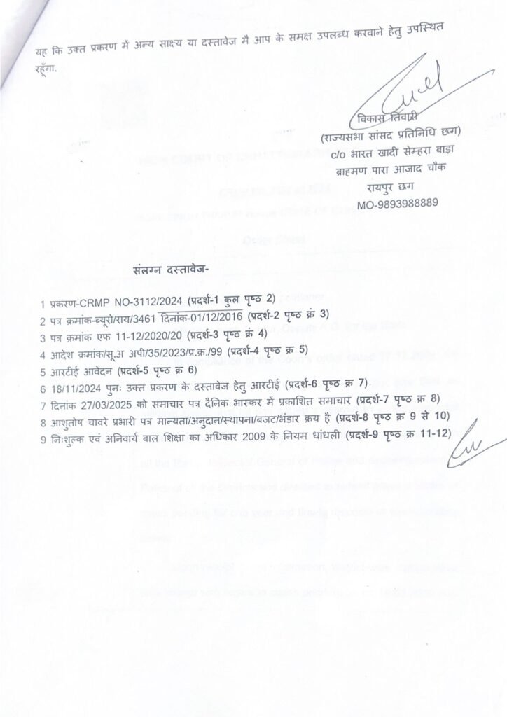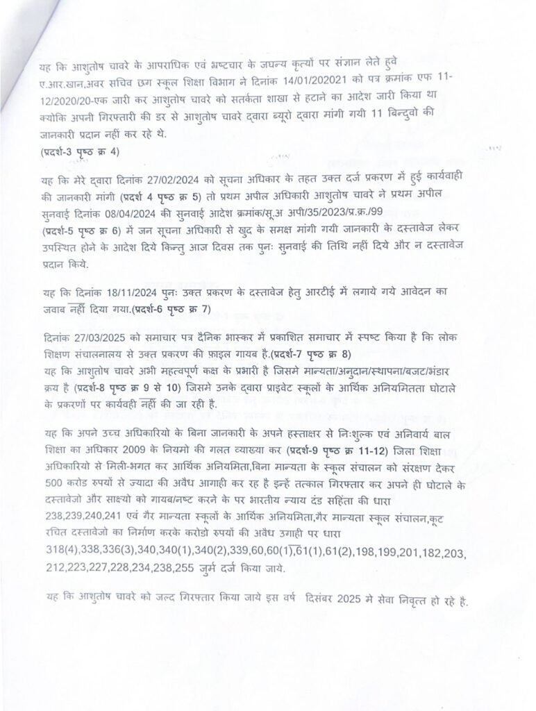 गौरतलब है कि चावरे इस वर्ष दिसंबर में सेवा निवृत्त होने वाले हैं। ऐसे में उनके खिलाफ कड़ी और त्वरित कार्रवाई की मांग जोर पकड़ रही है। विकास तिवारी ने पत्र में यह भी उल्लेख किया है कि वे संबंधित अन्य दस्तावेज़ और साक्ष्य प्रस्तुत करने के लिए तैयार हैं।