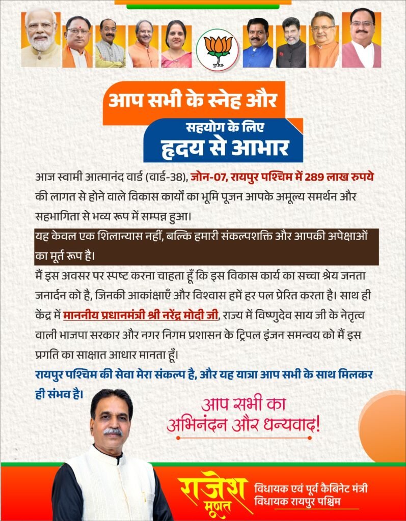 रायपुर पश्चिम में 289 लाख रुपये के विकास कार्यों का भूमि पूजन सम्पन्न, मूणत बोले_ भाजपा की ट्रिपल इंजन सरकार ला रही विकास में गति