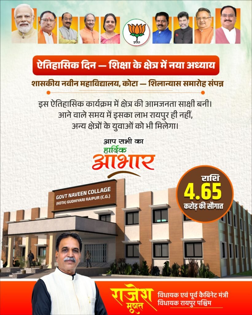 यहां यह बताना समीचीन होगा कि वर्ष 2018 में श्री राजेश मूणत ने ही इस महाविद्यालय को आरंभ कराया था, और उसके बाद पूरे 5 वर्ष तक इसका भवन नहीं बन पाया।