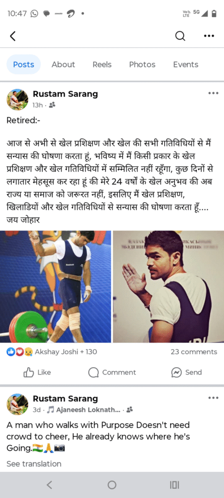 रुस्तम सारंग ने फेसबुक पोस्ट में साफ शब्दों में लिखा कि वह आज से खेल प्रशिक्षण और खेल से जुड़ी सभी गतिविधियों से संन्यास ले रहे हैं। उन्होंने कहा कि लगातार यह महसूस हो रहा है कि उनके 24 वर्षों के खेल अनुभव की अब न तो राज्य को और न ही समाज को जरूरत समझी जा रही है। इसी भावना के चलते उन्होंने खिलाड़ियों, प्रशिक्षण और खेल गतिविधियों से खुद को पूरी तरह अलग करने का निर्णय लिया है।